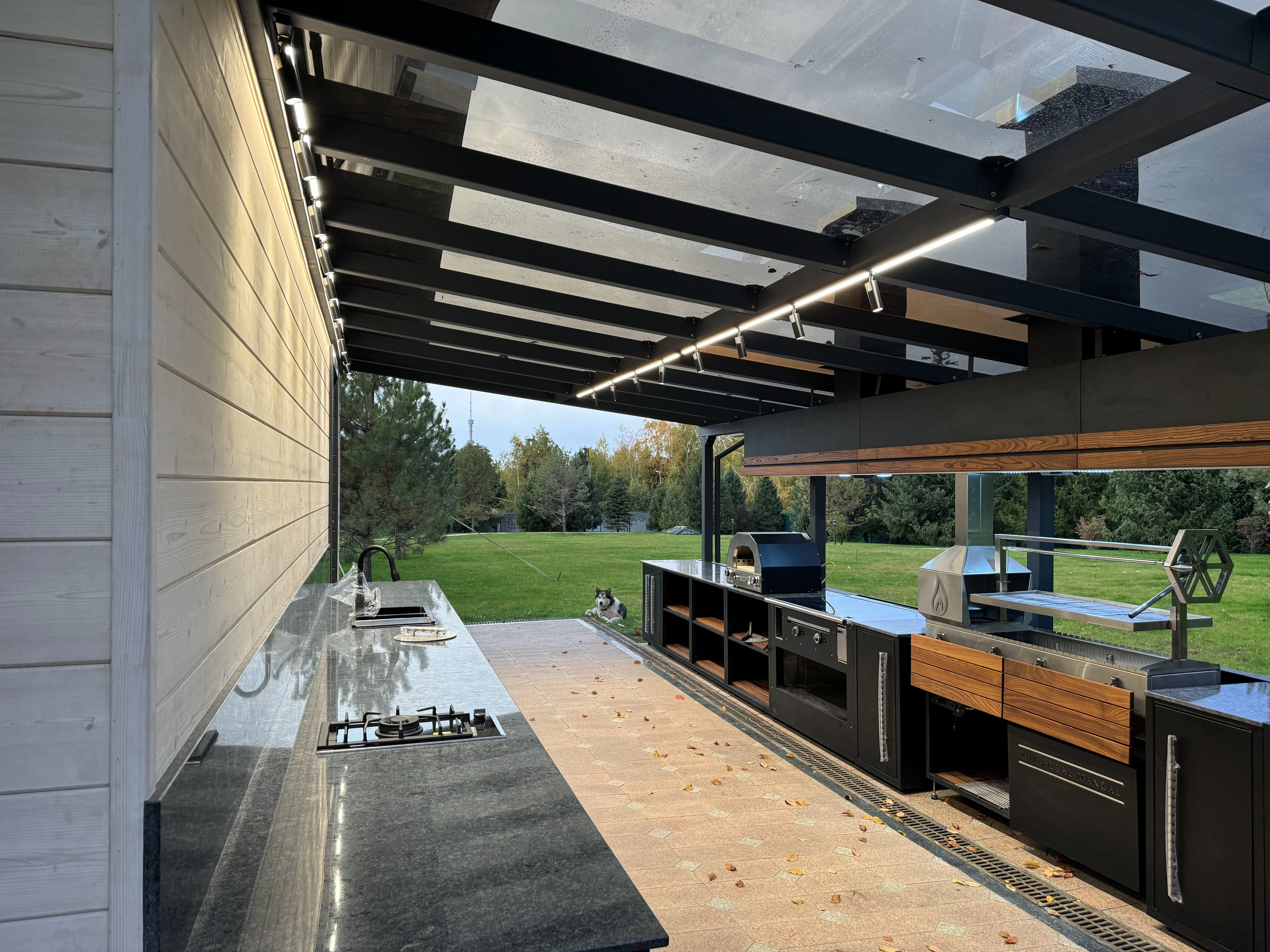 Навесы добавляют эстетическую привлекательность и завершенность к дизайну уличной кухни, создавая гармоничное и стильное пространство.